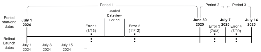 - Rollout Period(s): Dataview pulls in errors in the loaded Dataview period, as well as all other errors that occurred in the rollout event (includes all errors in schedule rollout periods that overlap with the loaded Dataview period).