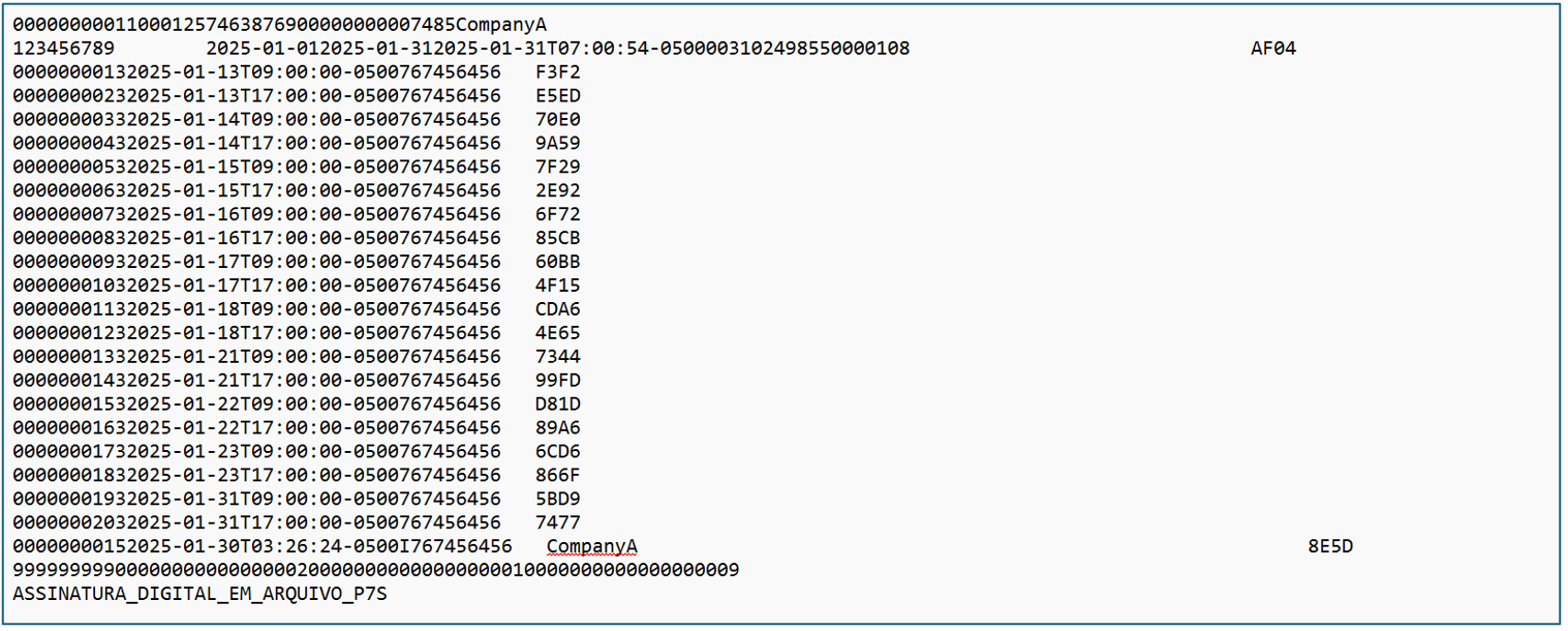 | Hash: | Hash code for the punch | Hash code (SHA-256) of the punch. Exclusively for REP-A and REP-P employees. | The Hash Code is created for a combination of three fields NSR, Punch Date Time, Employee CPF. | |