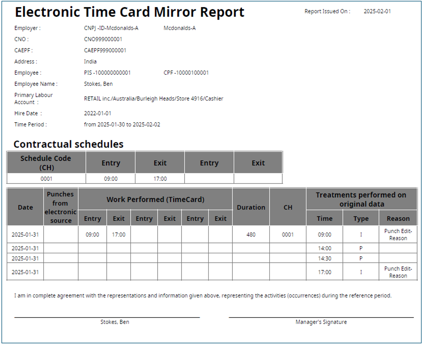 | Employee CPF: | Employee CPF | 14 | Employee CPF associated with the punch information being displayed. | Person Record > Additional Information > CPF of the employee. |